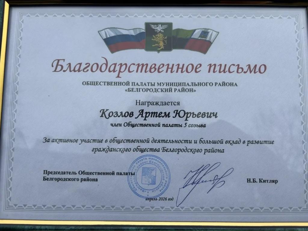 Артем Юрьевич работал в общественной палате 5-го созыва, за что получил благодарность за активную работу. Сейчас ему вновь доверили решением Совета депутатов Белгородского муниципального округа снова представлять интересы общества глухих в общественной палате.